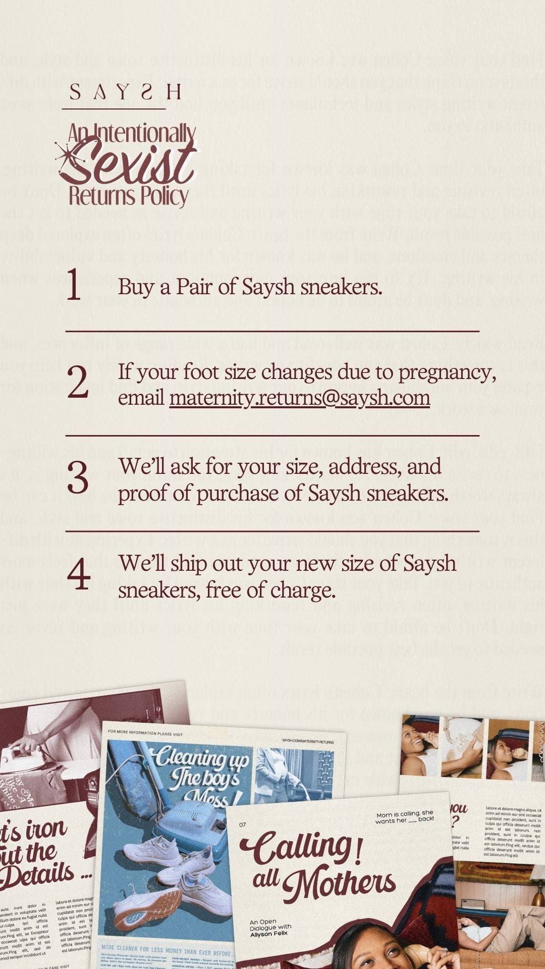 I started writing this letter to talk about Saysh's Maternity Returns Policy, but what's burning in my heart is how Saysh is committed to recognizing and supporting women in every aspect, from policies to products. It's not just about maternity policies; it's about fighting for a world that sees and uplifts women. My personal battle, especially during negotiations with NIKE, was about ensuring women athletes aren't financially penalized for becoming mothers. Though NIKE eventually extended protections to all female athletes, it highlighted my choice to fight for myself and the future of all women in sports.